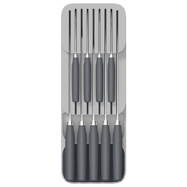 It features two levels for different blade lengths and can hold up to nine knives in a neat, compact space. Non-slip feet on the base stop the unit from sliding around in your drawer.