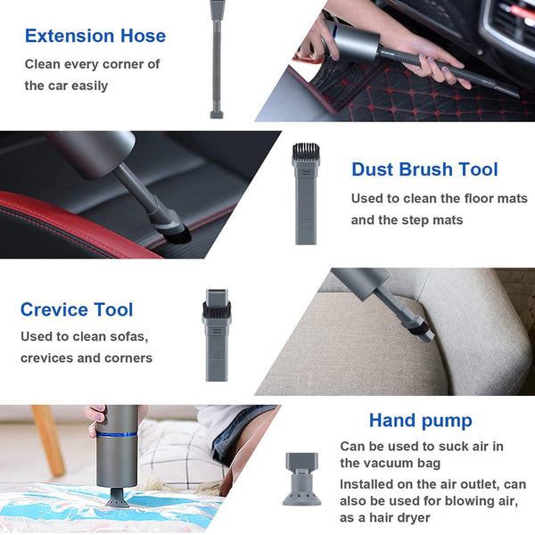 This handheld vacuum cleaner uses an 80W high-power motor where the suction power exceeds 4500pa. This car vacuum is equipped with a smart design, enabling it to clean small areas such as cabinets and kitchen drawers. It can also function as an air duster blower for dust removal, and can also be used to suck air in a vacuum storage bag. One end of the machine is connected to the suction nozzle for vacuuming, and the other end is connected to the suction nozzle for blowing dust.