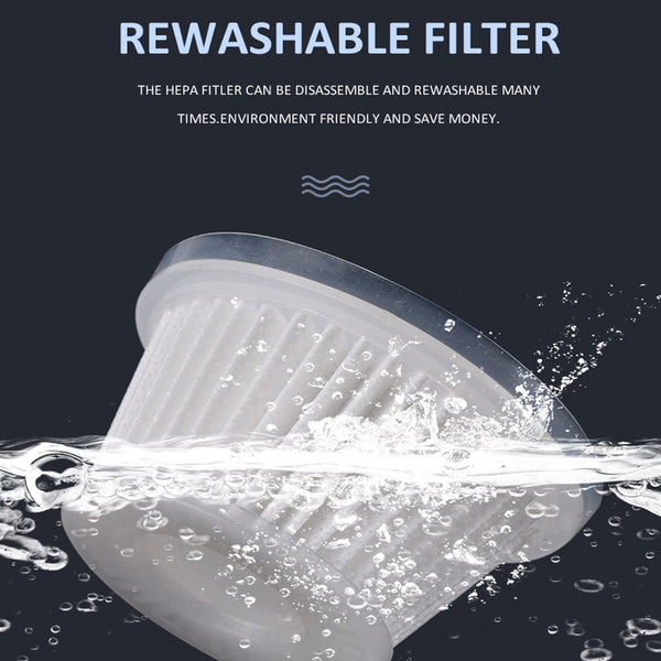 This cordless rechargeable handheld vacuum cleaner is lightweight and easy to carry, helping you to easily clean all places without using heavy and traditional vacuum cleaners with tangled wires. The USB vacuum adopts a dust container design and supports multiple processes of filtration to ensure that the surface is thoroughly cleaned.
