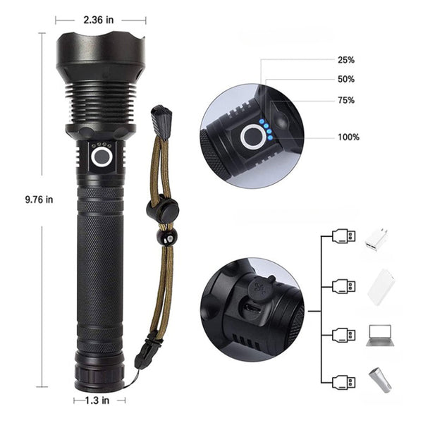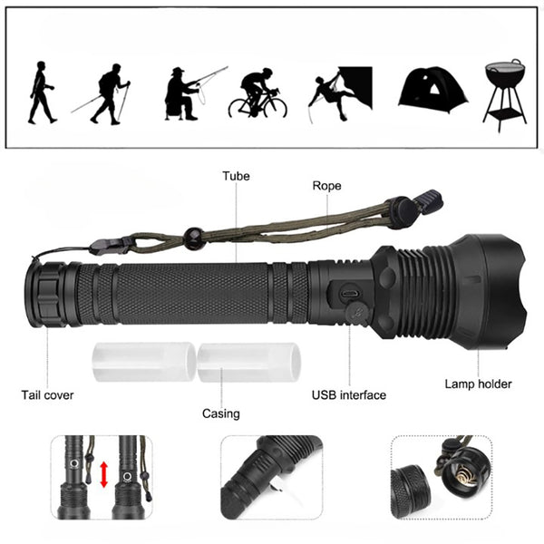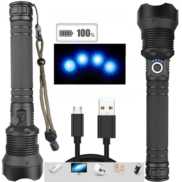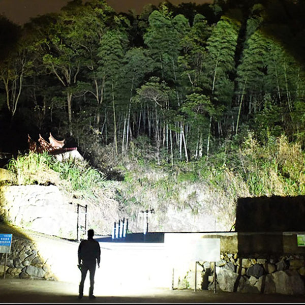 90000 lumens flashlight can effortlessly illuminate two football fields, providing people a dependable and convenient lighting tool. The flashlight is convenient to pack in your car or survival kit.