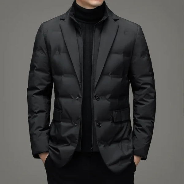 The Men's Winter Fake Two-piece Warm Blazer appears to be a stylish and warm option for the colder months. It is described as a business leisure warm blazer with a stand collar, giving it a sophisticated and trendy look. The "fake two-piece" design suggests a layered appearance, providing style and warmth without the bulk of actual layers. This blazer may be suitable for various occasions, offering both comfort and a polished look.