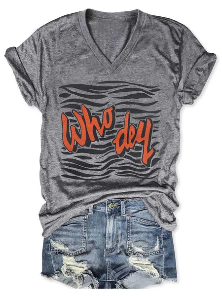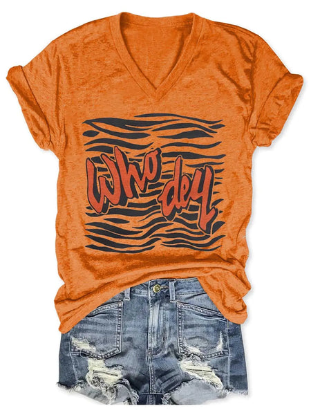 Introducing the Women Who Dey Tiger V-Neck Shirt! Show off your support for the Cincinnati Bengals with this stylish and eye-catching t-shirt. Made from breathable and comfortable material, this shirt is designed to keep you cool throughout your day. The vibrant colors and modern design show off your team pride like never before. The simple yet bold tiger graphic is sure to become a conversation starter at any game gathering or social event – perfect for showing your love of the Cincinnati Bengals! With its timeless fit, this shirt looks great no matter where you go. Whether you're just hanging out at home or joining in on the tailgate fun, you can't go wrong with this classic piece of fan apparel. Sport your passion in style; get the Women Who Dey Tiger V-Neck Shirt today!