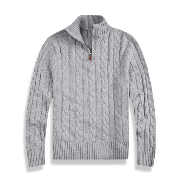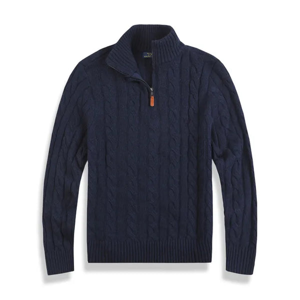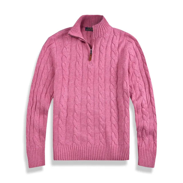 A men's wool casual sweater, possibly featuring a small pony pull and a half-zip design. Here are some key points based on your description: